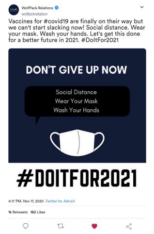 Collaborated with the Wolf Pack Relations team, faculty advisors, and the Gattuso Coalition to shape the #DoItFor2021 concept—focused on motivating students to protect their future by making safer choices now.